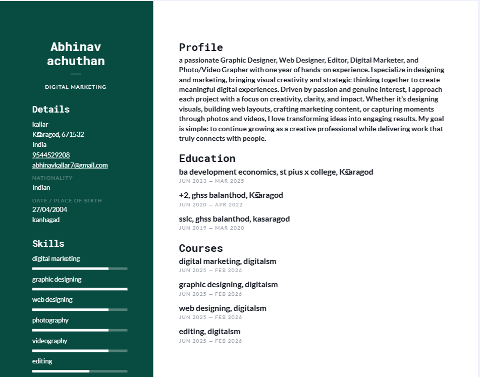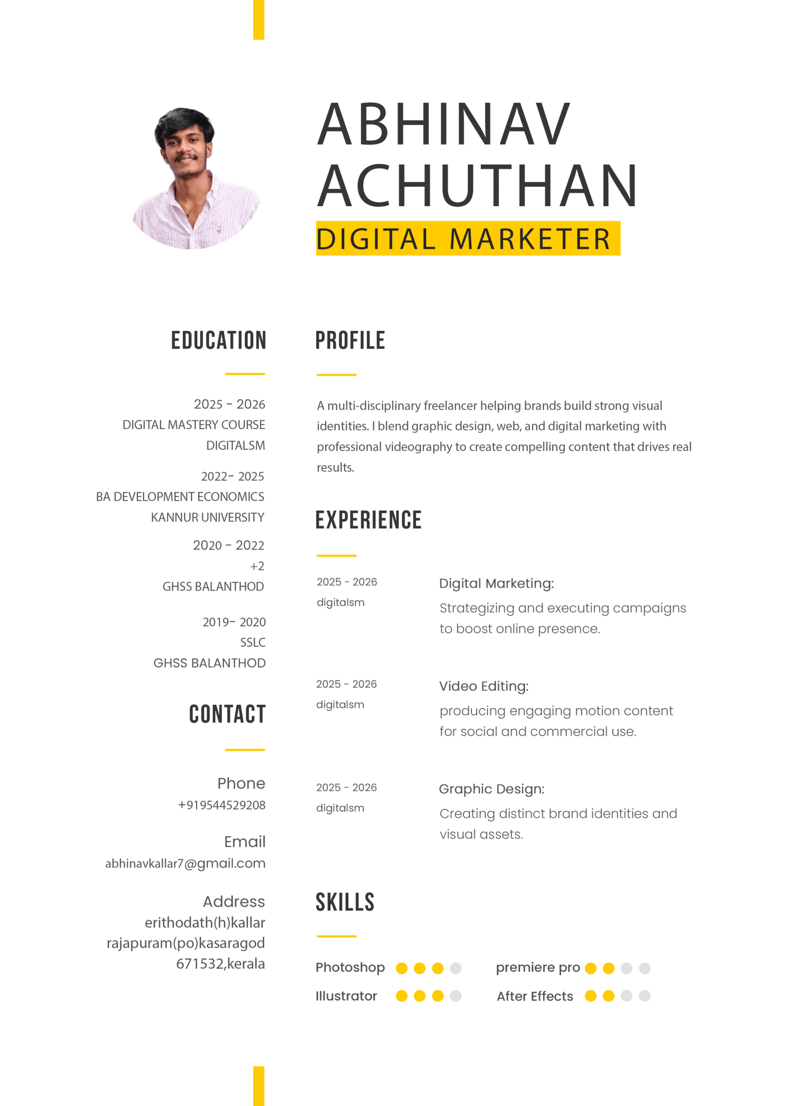 Hi, I’m Abhinav Achuthan — a passionate Graphic Designer, Web Designer, Editor, Digital Marketer, and Photo/Video Grapher with one year of hands-on experience. I specialize in designing and marketing, bringing visual creativity and strategic thinking together to create meaningful digital experiences.